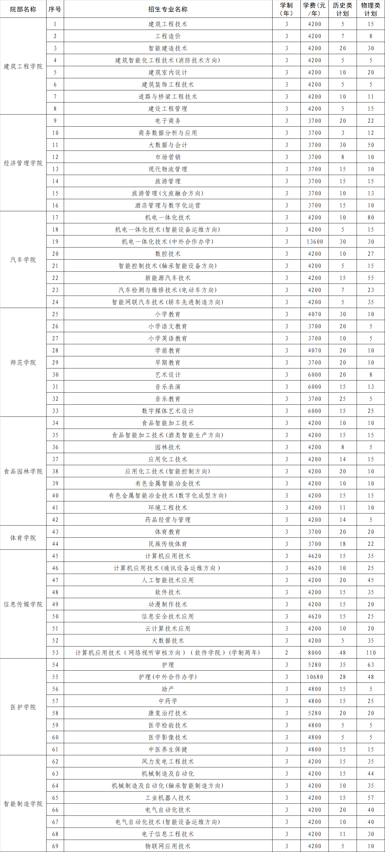 目前,学院设有汽车学院、建筑工程学院、智能制造学院、经济管理学院、食品园林学院、信息传媒学院、师范学院、医护学院、体育学院、马克思主义学院等10个二级学院和基础部1个教学部,另设有河南省示范性软件学院,国际交流与合作学院。学院有教职工1291人,具有研究生学位的教师占专任教师的65%;馆藏图书161.9万余册,教学设备总值2.3亿余元。有中央财政支持的重点建设专业2个、中央财政支持的实训基地3个,省级以上特色和教改试点专业11个、省部级示范性实训基地15个、精品课程28门、优秀教学团队17个、教学名师19人。
