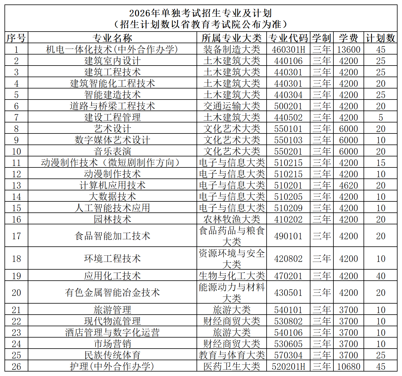 三门峡职业技术学院2026年单独考试招生计划